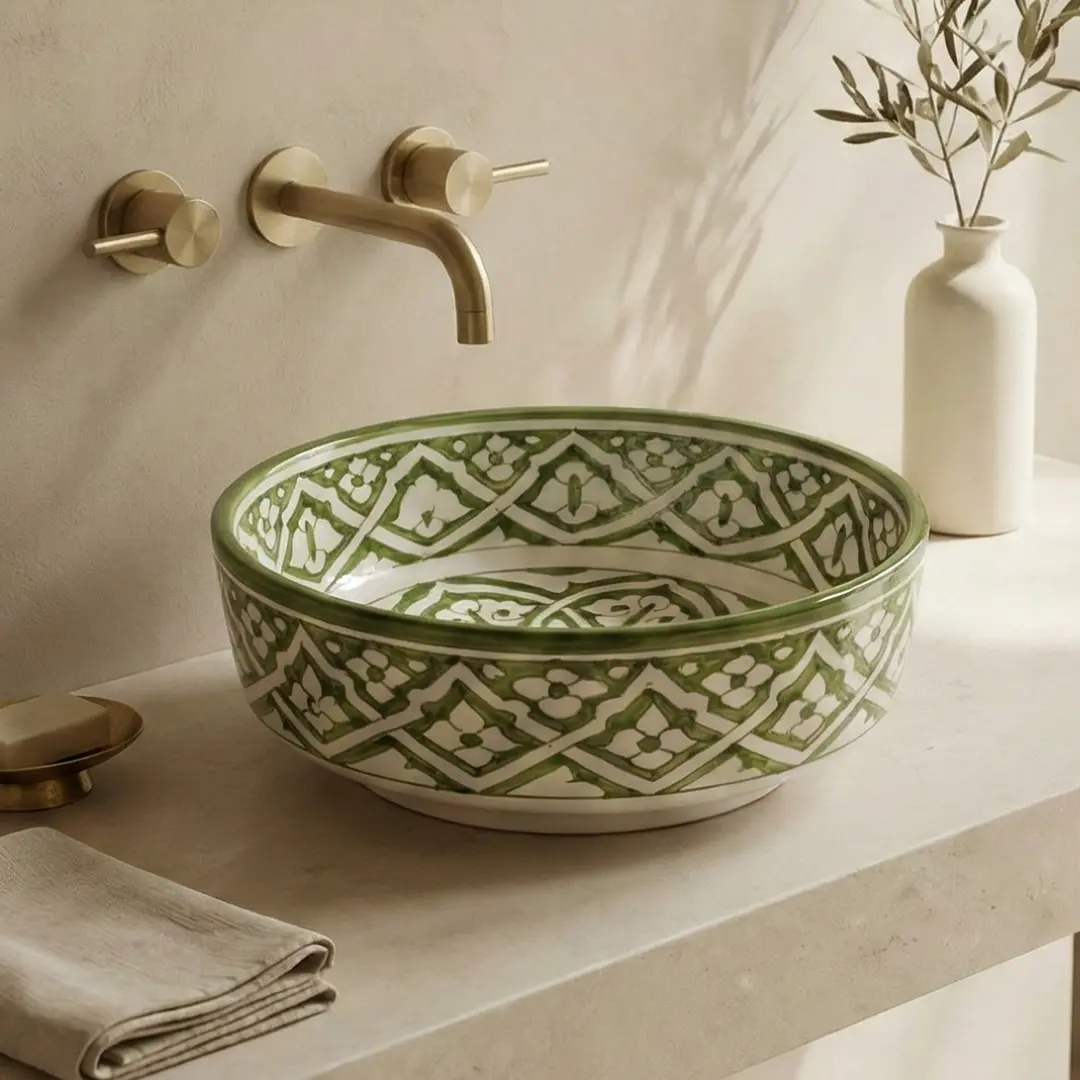 Moroccan ceramic sinks are handcrafted masterpieces that combine functionality with the artistry of traditional Moroccan craftsmanship. Made from high-quality clay, each sink is shaped by skilled artisans who use techniques passed down through generations.